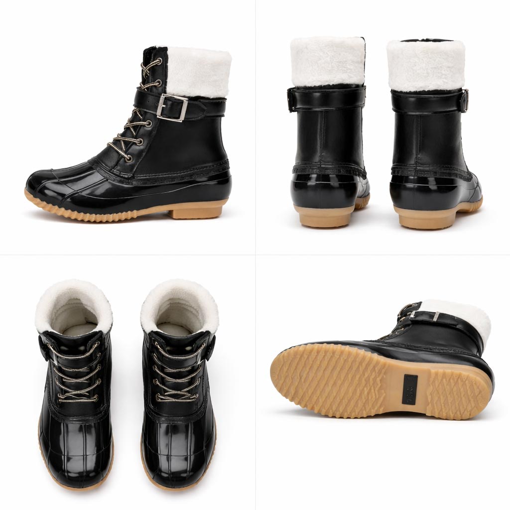 A classic duck-boot silhouette with a polished rubber lower and a clean PU shaft. The fold-over plush cuff softens the profile, while the lace-and-buckle front keeps the look grounded in winter streets and lodge steps.